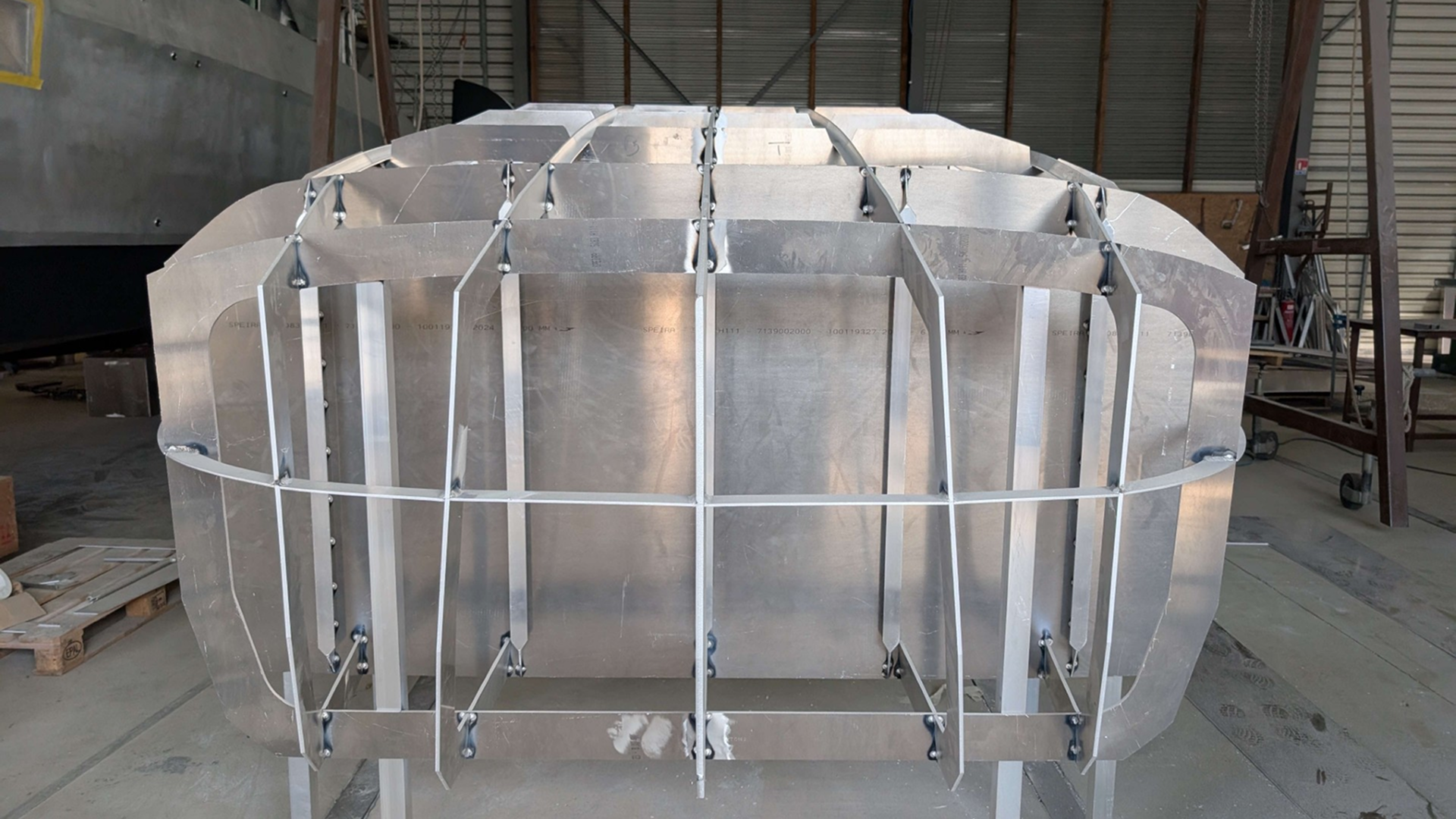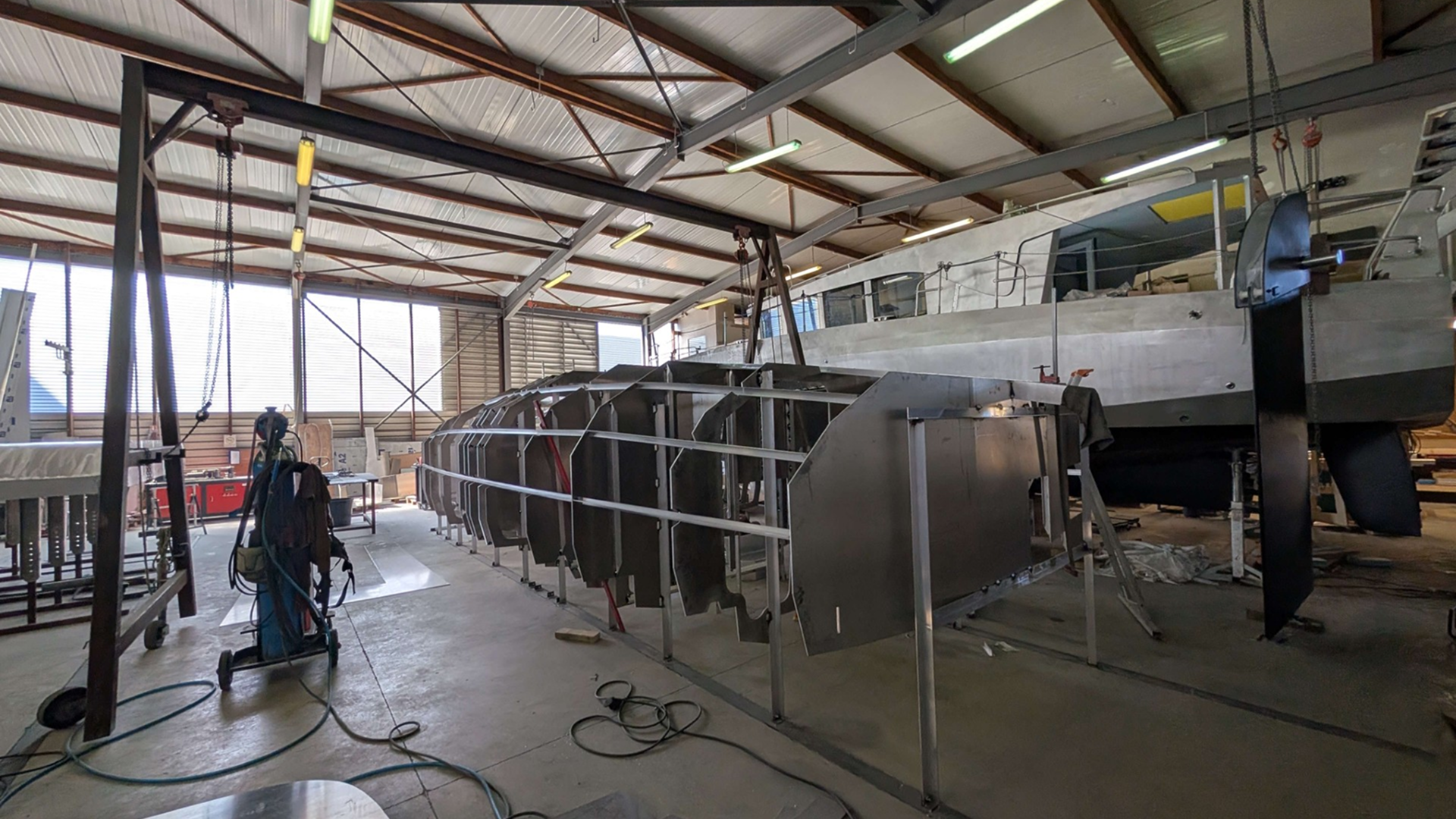Ce mois-ci, l’ossature du Sea-Scow 33’ s’est révélée avec l’installation des couples et des premières lisses. Cette étape essentielle dessine désormais le squelette du bateau, matérialisant ses lignes larges et puissantes. On distingue déjà le volume généreux de la carène, tandis que les structures internes commencent à donner une idée des futurs aménagements. L’alignement précis des éléments et les premiers points de soudure marquent un jalon technique important dans l’assemblage de la coque.