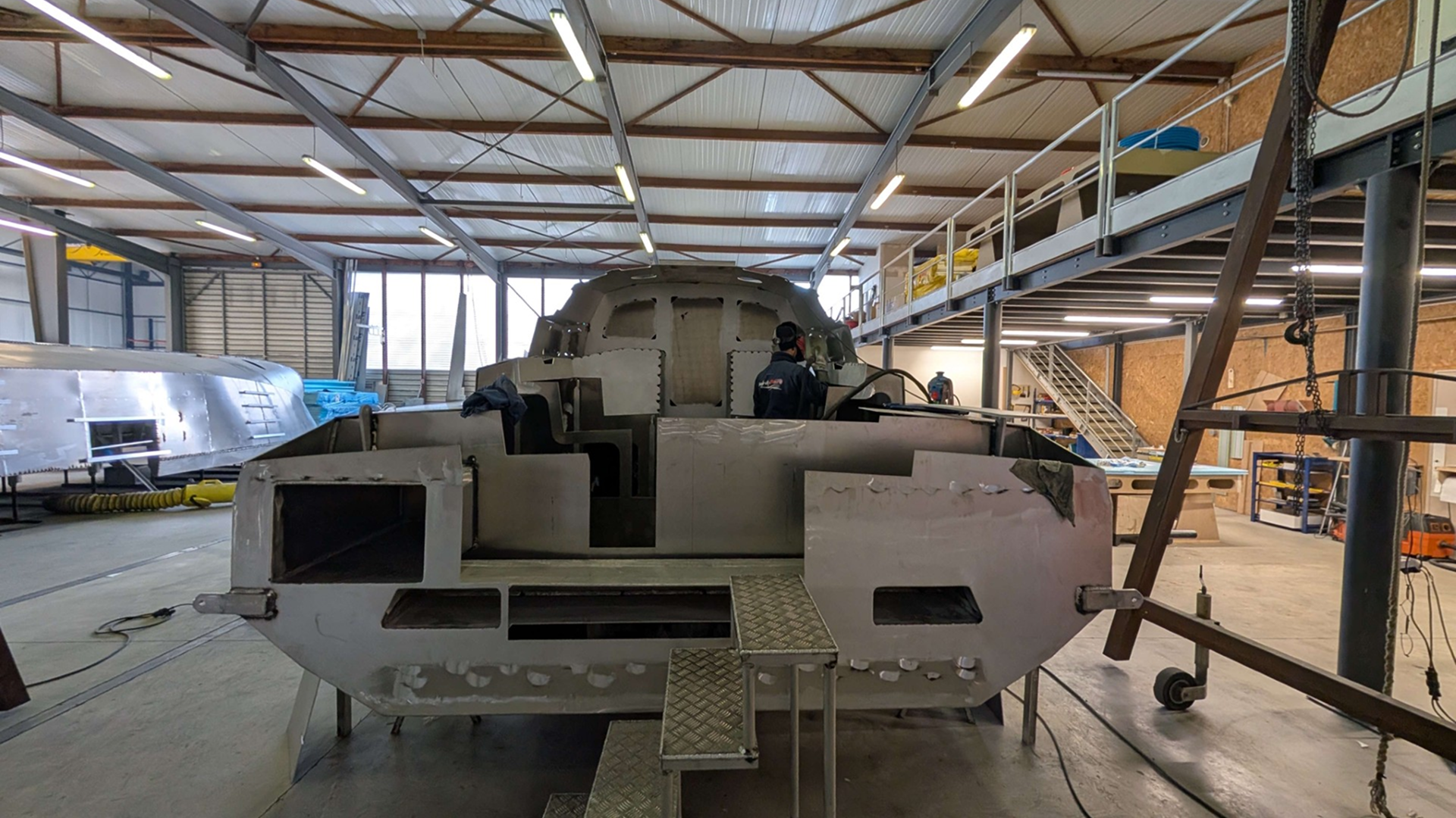 Ce mois-ci, la structure principale du Sea-Scow 33’ a nettement progressé. La coque est désormais assemblée sur toute sa longueur, et les premiers éléments de pont ont été positionnés. Les volumes intérieurs commencent à se dessiner, offrant un aperçu tangible des futurs espaces de vie. Les soudures sont soignées, les ajustements précis, et l’ensemble commence à révéler les lignes puissantes et innovantes du bateau.